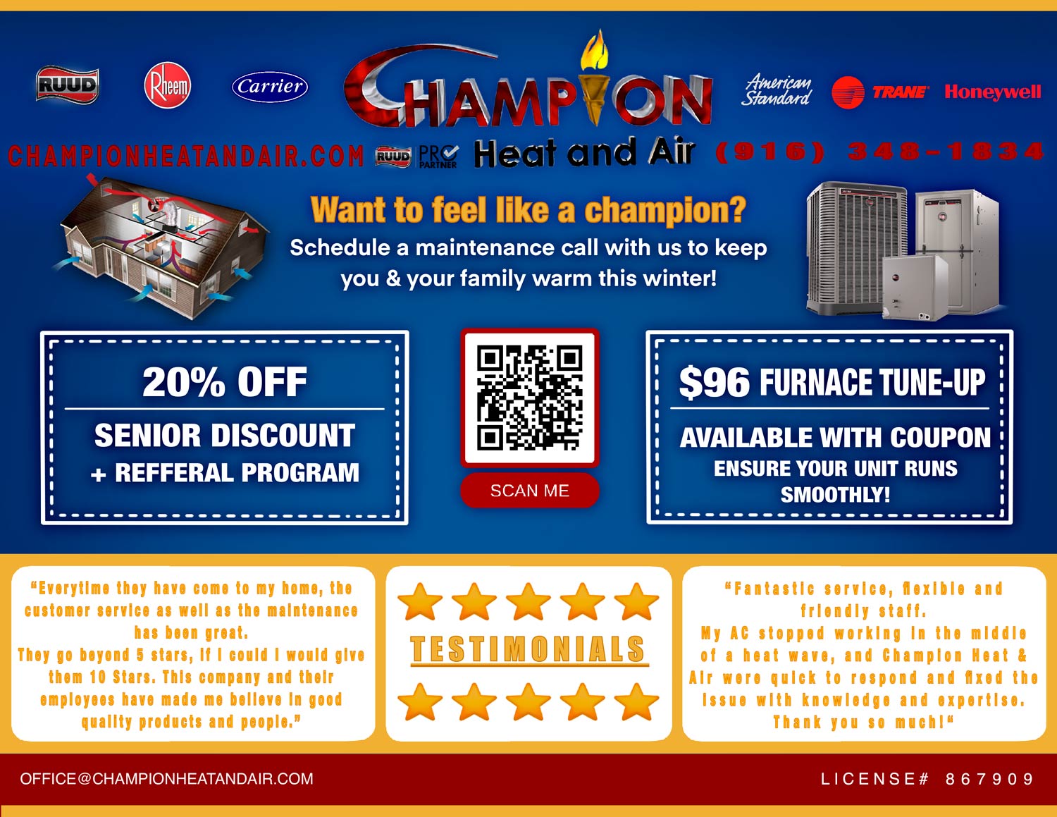Champion Heat and Air is a Family-Owned and operated appliance company based in Sacramento, CA and services the surrounding Areas of California. We specialize in appliances and Air Conditioner repairs, service, installation and maintenance of all Air Conditioning and Heating Units and Major Home and Kitchen Appliances. Our Technicians service All Major brands of Air Conditioning and Heating Systems. Our skilled Technicians will gladly travel to your location to repair your damaged appliances.